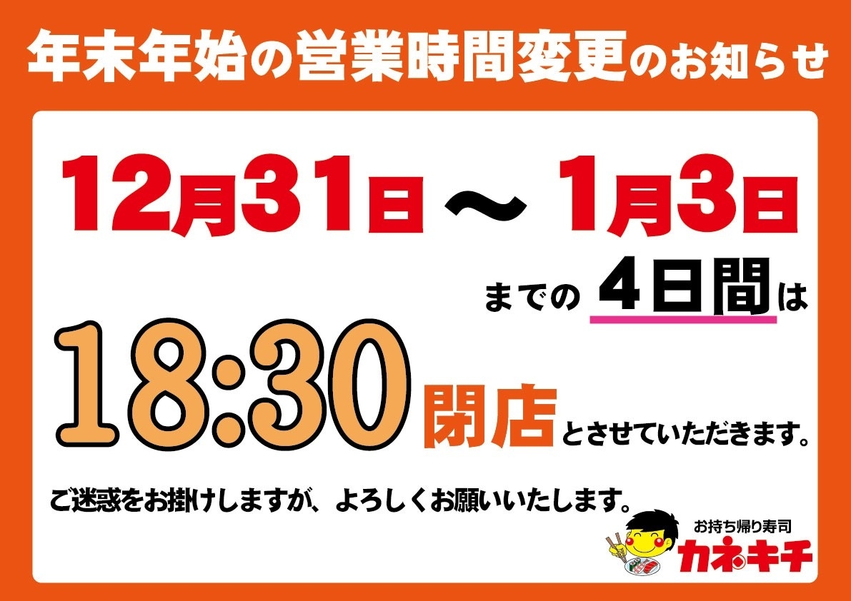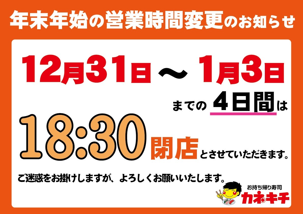 お持ち帰り寿司カネキチ 年末年始営業時間のお知らせ