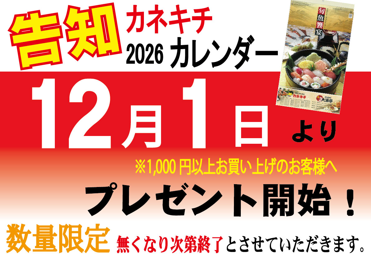 2025年11月09日(日) 【告知】お持ち帰り寿司カネキチカレンダープレゼントについて 12月1日よりカレンダープレゼント! ※1,000円以上お買い上げのお客様のみとなります。 なくなり次第終了ですのでお早めにご来店ください。