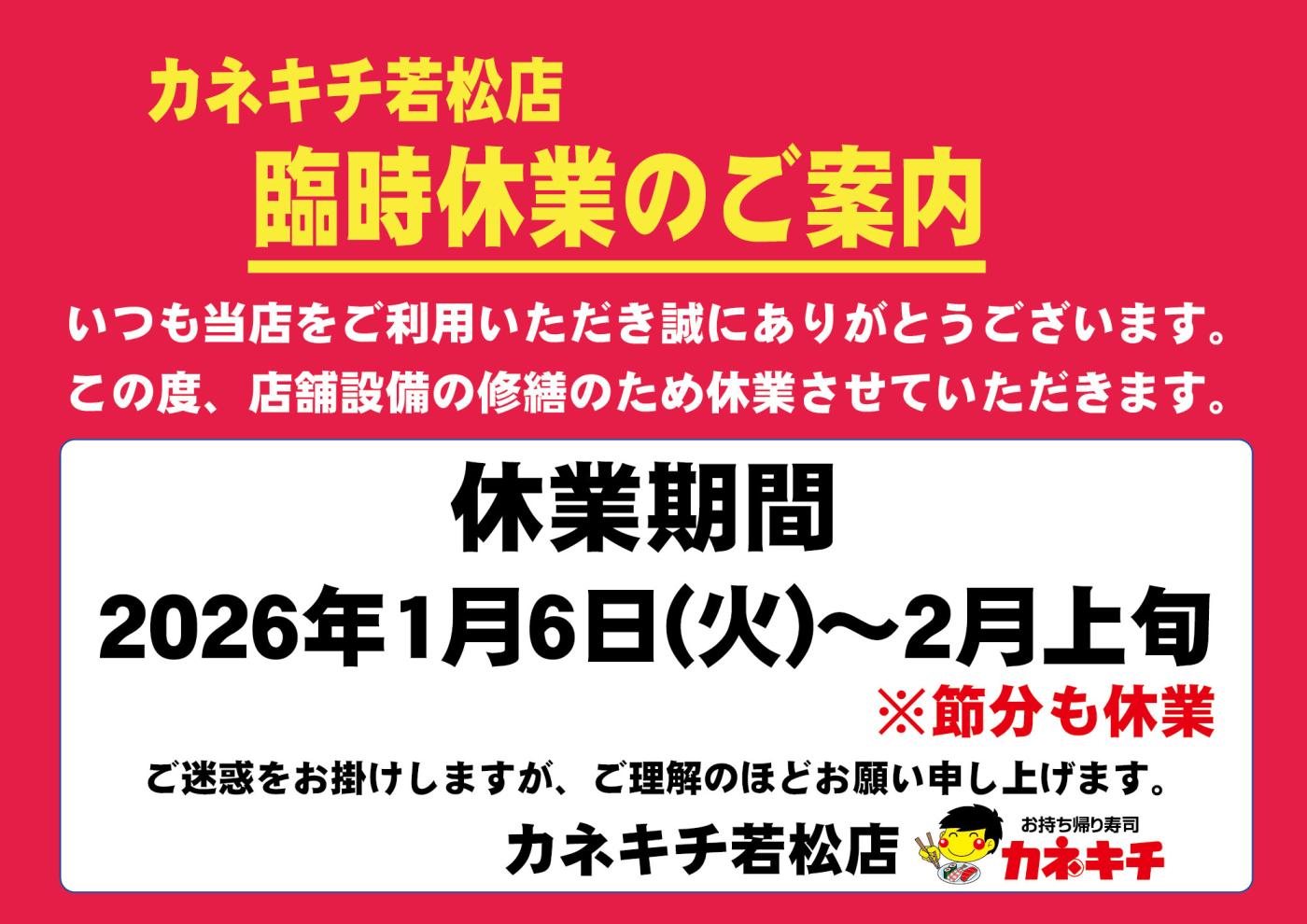 カネキチ若松店 臨時休業のお知らせ