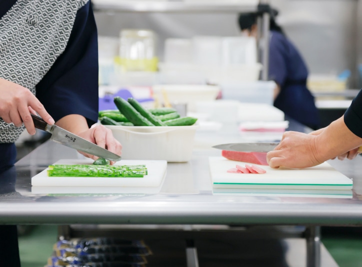 カネキチでは切る食材によってまな板を使い分けています。野菜は野菜用の鮮魚は鮮魚用のまな板を使用しています。間違えないように色分けをして衛生管理を徹底しています。